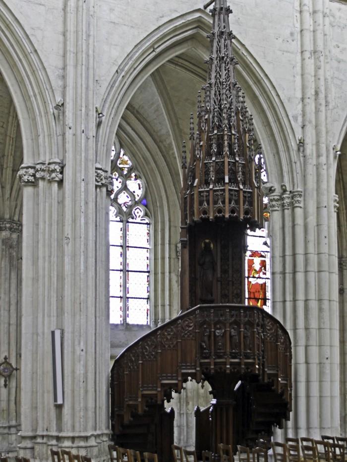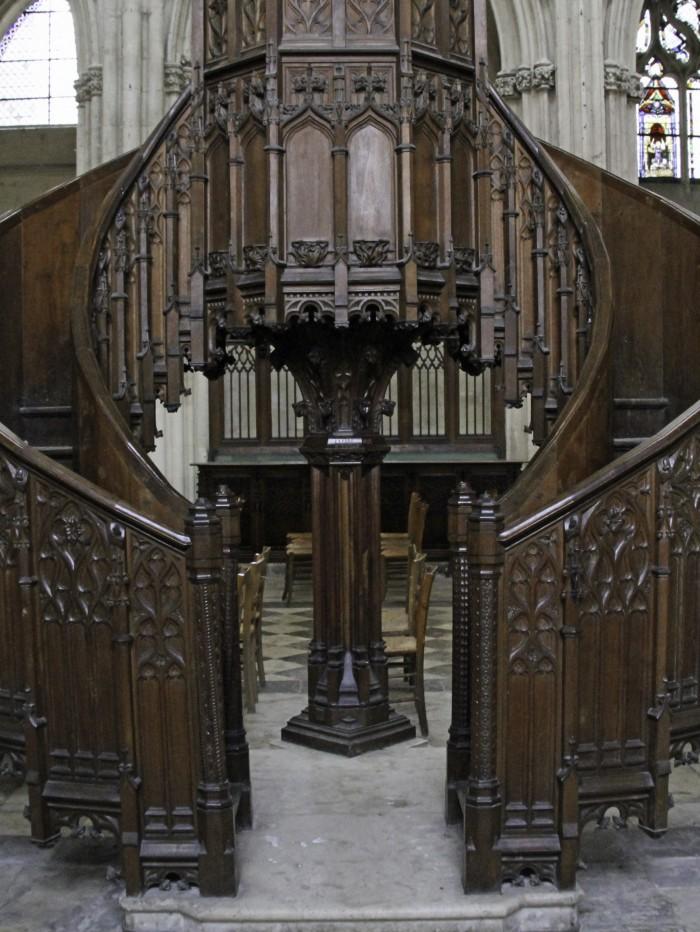 Gotische preekstoel met 2 opgangen. Het houtsnijwerk is rijk bewerkt.Deel deze preekstoel