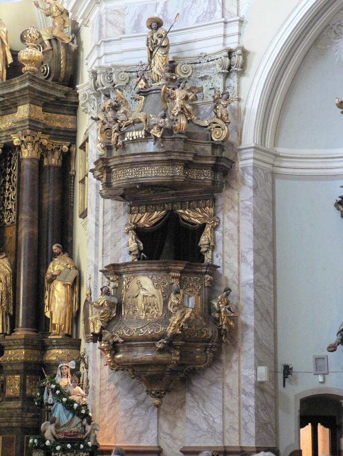 Rijk versierde barokke preekstoel, met beelden aan de kuip en op het klankbord.Deel deze preekstoel