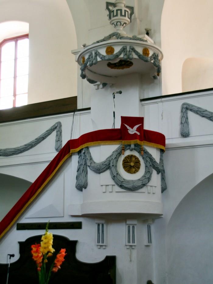 Preekstoel uit 1770, versierd met Tsjechisch loof.Deel deze preekstoel