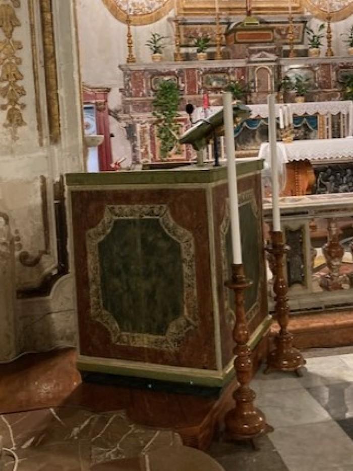 Vierkante houten (niet verhoogde) preekstoel, met decoraties op de zijwandenDeel deze preekstoel