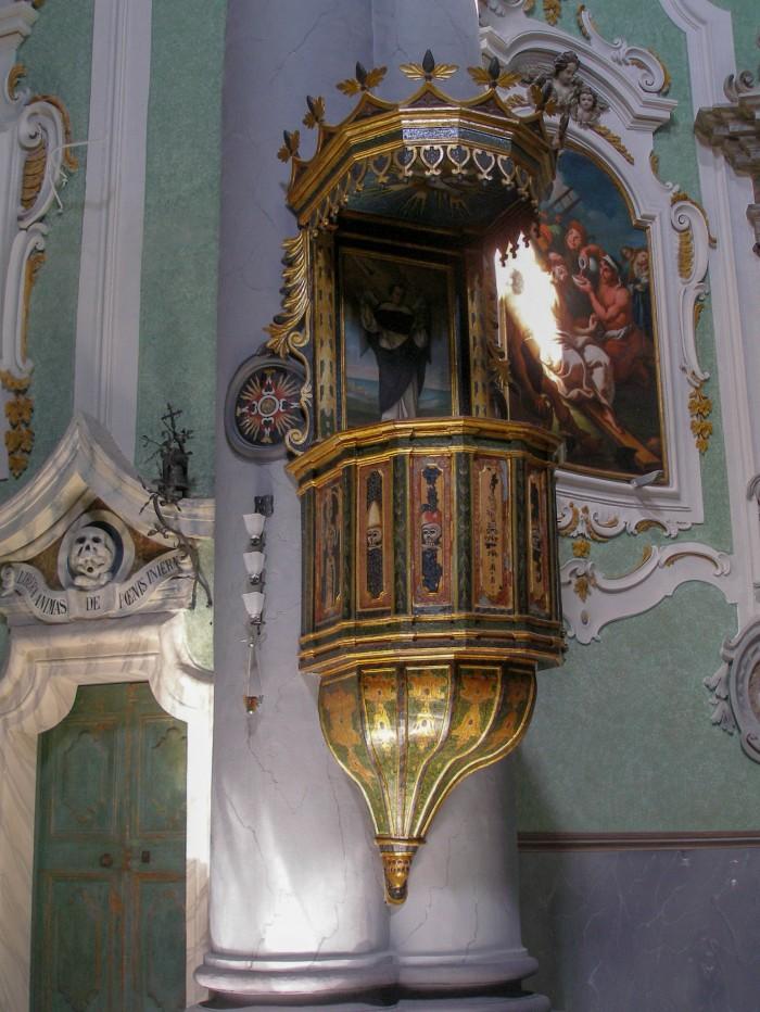 Rijkbeschilderde houten preekstoel. Aan de muurzijde hangt een schilderij van Franciscus van Assisi.Deel deze preekstoel