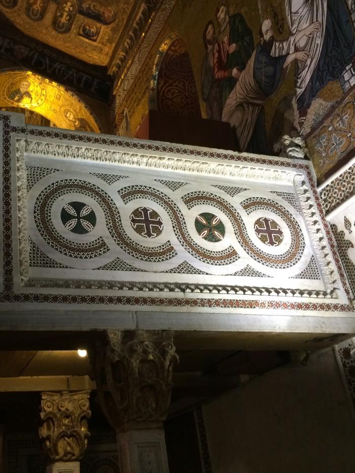 Capella Palatina, een 12e-eeuwse hofkapel binnen het Palazzo dei Normanni (Paleis van de Normandiërs), ook bekend als Palazzo Reale (Koninklijk Paleis). Deze kapel werd in 1143 ingewijd. De kapel is versierd met byzantijnse mozaïeken waarop taferelen uit het leven van Jezus Christus en de apostel Paulus en uit het Oude Testament worden uitgebeeld.Deel deze preekstoel