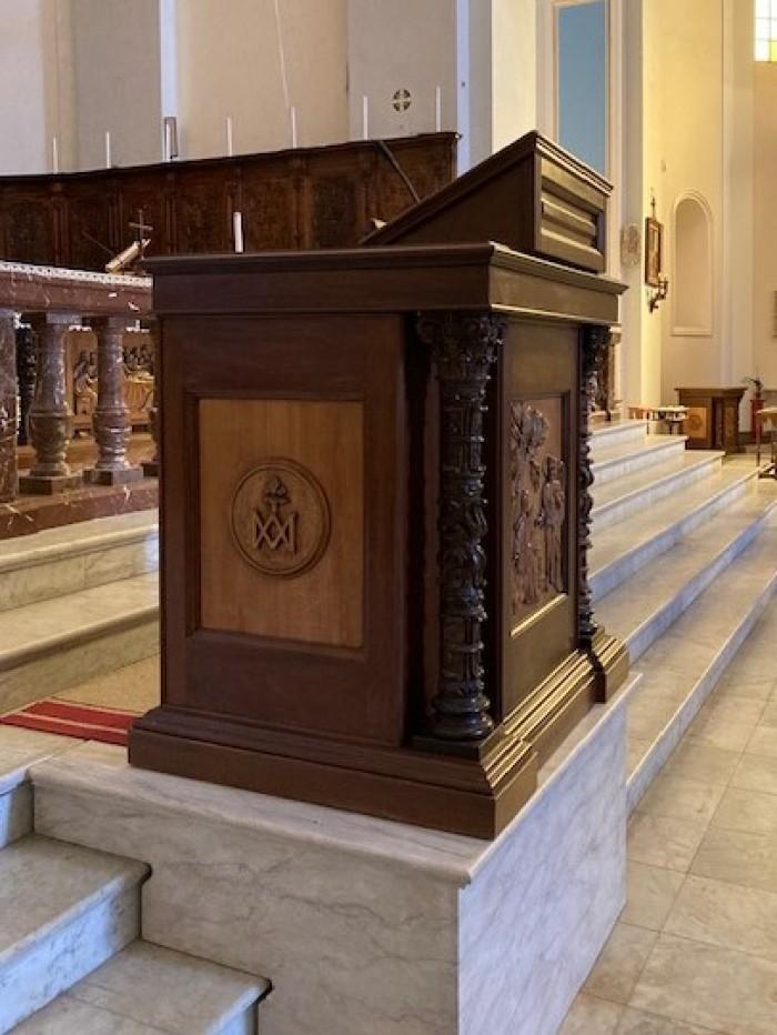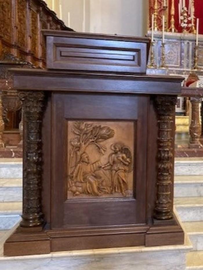 Rechthoekige houten preekstoel, met aan de voorzijde twee bewerkte zuilen en daartussen een houtgesneden decoratie (verschijning van een engel)..Deel deze preekstoel