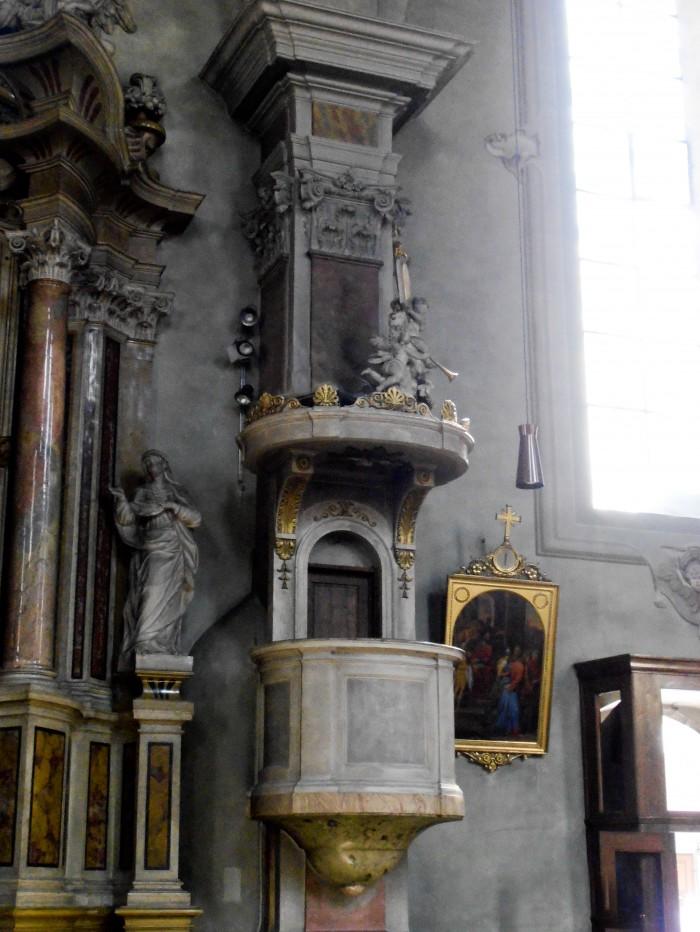 Granieten preekstoel uit 1758, barokstijl.Bovenop het klankbord staat de aartsengel Michael.
