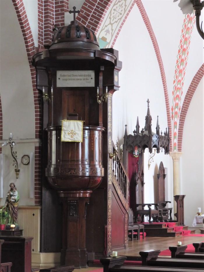 Deze preekstoel in empirestijl, kan met recht een van de meest opmerkelijke elementen uit het interieur van de kerk worden genoemd. De preekstoel is gemaakt van een zeldzaam type mahonie en het oppervlak is bedekt met een inlegwerk van rijke plantversieringen en elegante arabesken.Deel deze preekstoel