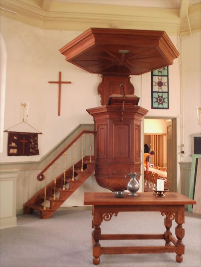 Houten preekstoel in een zogenaamde zaalkerk.