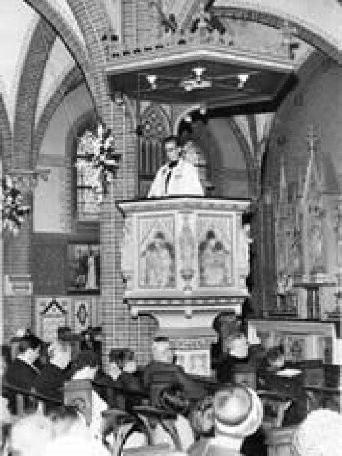 Deze preekstoel is helaas uit de kerk verwijderd.Op de foto uit 1963 ziet u pater Thomassen vanaf deze plek zijn homilie houden. De figuren op de zijkant van de preekstoel beelden de grote profeten af. Zij zijn van de hand van de maker van de altaren: Hendrik van der Geld.