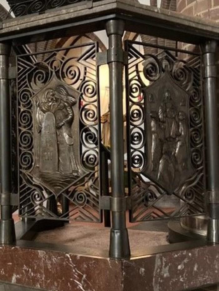 Smeedijzeren preekstoel met afbeeldingen op de kuip.