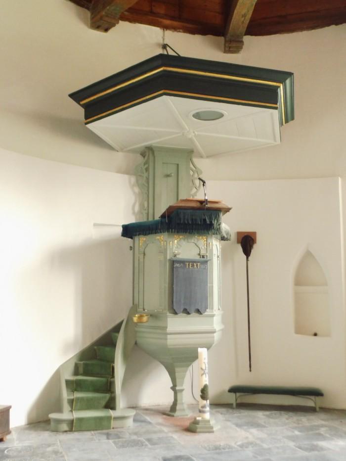 Een eenvoudige zeskantige kansel versierd met houtsnijwerk.De preekstoel (en het interieur) werd in de Franse tijd geverfd omdat Napoleon belasting hief op eikenhout, en zo kon men de belasting ontlopen.