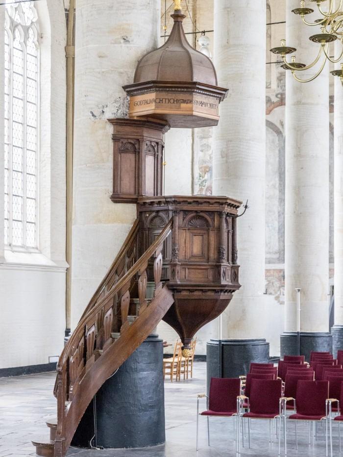 Tot de een van de oudste onderdelen van het interieur behoort de eenvoudige zeskantige preekstoel. Derck van Gendt, een kistenmaker uit de nabijgelegen Bergstraat vervaardigde in 1593 het klankbord dat boven de kansel hangt. Op de kanselbekroning staat de tekst: ‘Godt almachtisch sin woert is crachtich in ewichkeit’.Deel deze preekstoel