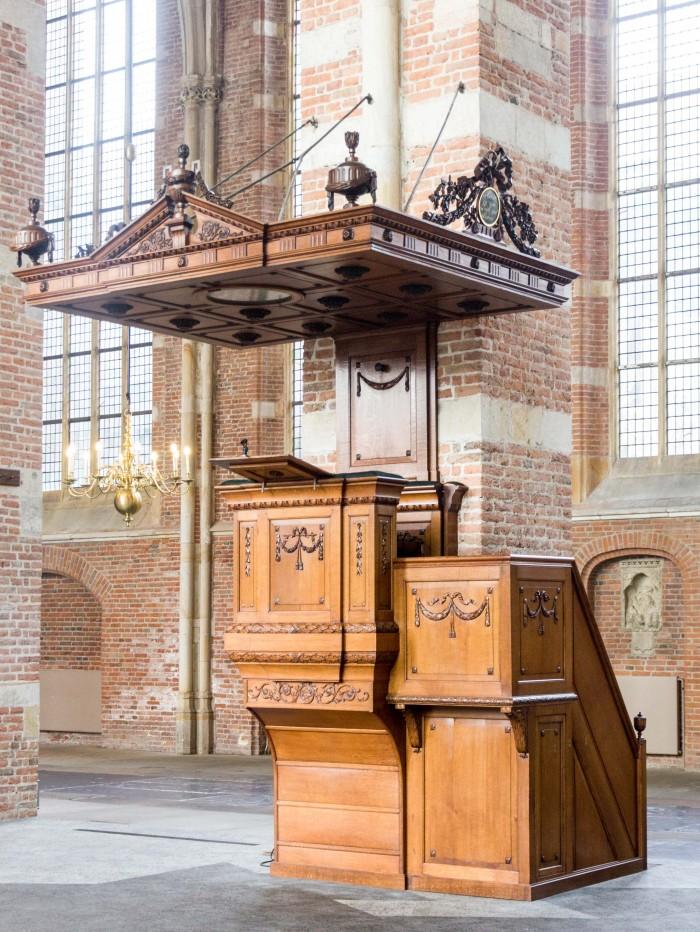 Deze preekstoel in Lodewijk XVI-vormen is uit 1781 en gesneden door P.J. Zickler naar ontwerp van G.G.J. van Suchtelen. Mogelijk komt de preekstoel oorspronkelijk uit de Broederenkerk.Deel deze preekstoel