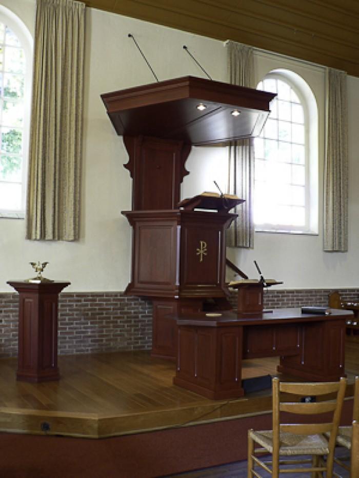 Kerk uit 1709, met modern ingericht liturgisch centrumDeel deze preekstoel