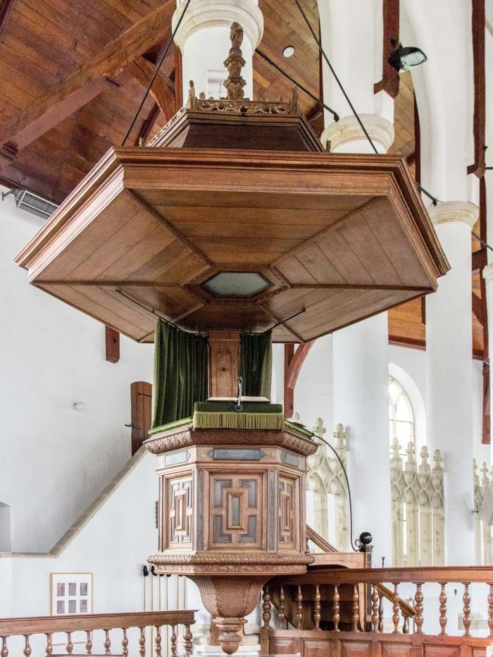 Eiken preekstoel met ebbenhout ingelegd uit 1622, met klankbord waarin oudere elementen zijn verwerkt. De preekstoel is vervaardigd door kistenmaker Syuert Hieroniemus. Op het klankbord staat een leeuw die het stadswapen van Franeker vasthoudt.De predikant bereikt de kansel via een trap met 7 treden.Daarover is het volgende geschreven: