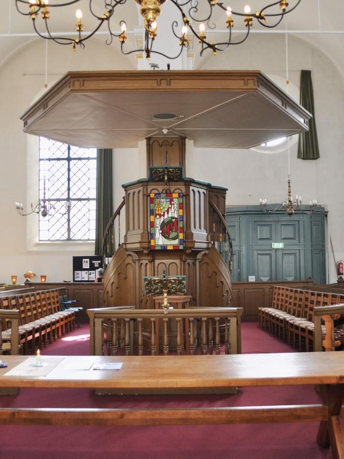 Preekstoel met twee trap-opgangen, groot klankbord en rondom een koorhek uit 1849-1851 naar ontwerp van I. Warnsinck.Deel deze preekstoel