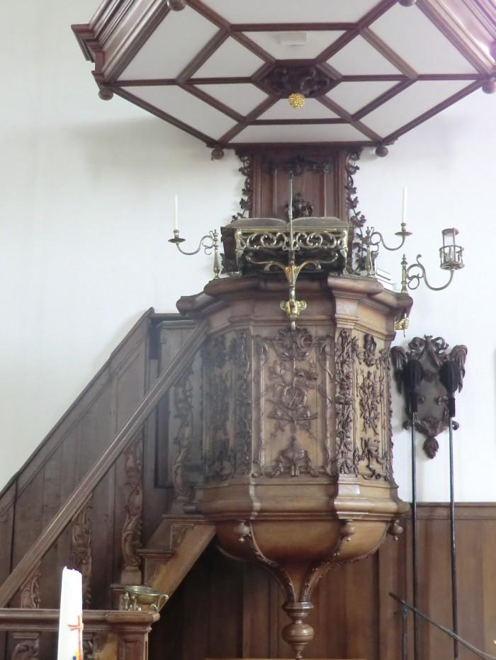 De preekstoel in deze zgn.Centraal kerk in de Lodewijk XVI stijl is gemaakt door houtsnijder Yge Rintjes uit Dokkum. In de zijkanten en aan de trapleuning zijn takken en bladeren met eikels afgebeeld. Op de preekstoel staat een zandloper. Het koperwerk is gemaakt door Lieuwe Geerts uit Leeuwarden.Deel deze preekstoel