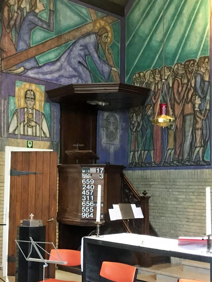 Deze opvallende kerk is in 1928 gebouwd. Van binnen is de kerk versierd met fresco's van Chris Lebeau, die sterk doen denken aan socialistisch-realistische kunst.Achter de preekstoel wordt de lijdensweg afgebeeld (Via Dolorosa), een priester die de mis opdraagt en de zweetdoek van Veronica.
