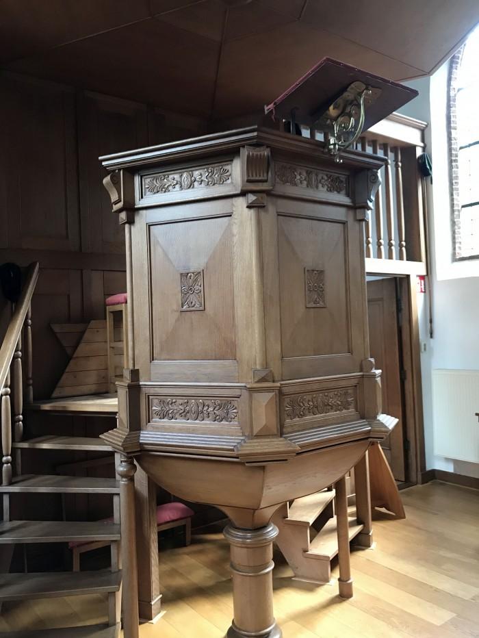 Een vrijstaande, ogenschijnlijk aangebouwde, houten preekstoel zonder specifieke stijlkenmerken.Deel deze preekstoel
