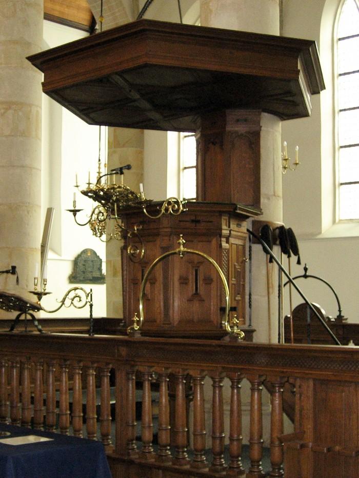 De ruimte rond de 17e eeuwse preekstoel wordt de dooptuin genoemd. Om de zware Statenbijbel te kunnen dragen is de preekstoel voorzien van een degelijke koperen lezenaar.Deel deze preekstoel