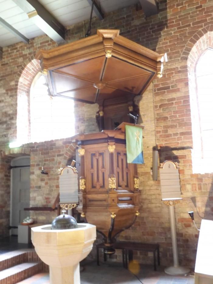 De 17e-eeuwse preekstoel had een wat erg forse trap uit 1930 die is vervangen door een eenvoudig luchtig open steektrapje.Deel deze preekstoel