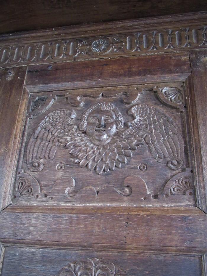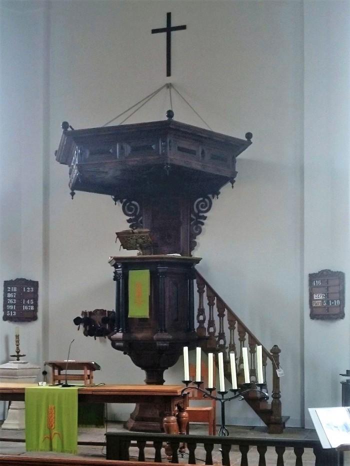 Deze eikenhouten preekstoel is uit 1614 en komt oorspronkelijk uit de Grote Kerk. De baluster van het trapje is afkomstig uit een Amsterdams grachtenpand. Op de preekstoel een smeedijzeren lezenaar met daarop enkele familiewapens. Op de achterwand onder het klankbord een houtsnijwerk met een engel (zie detailfoto).Deel deze preekstoel