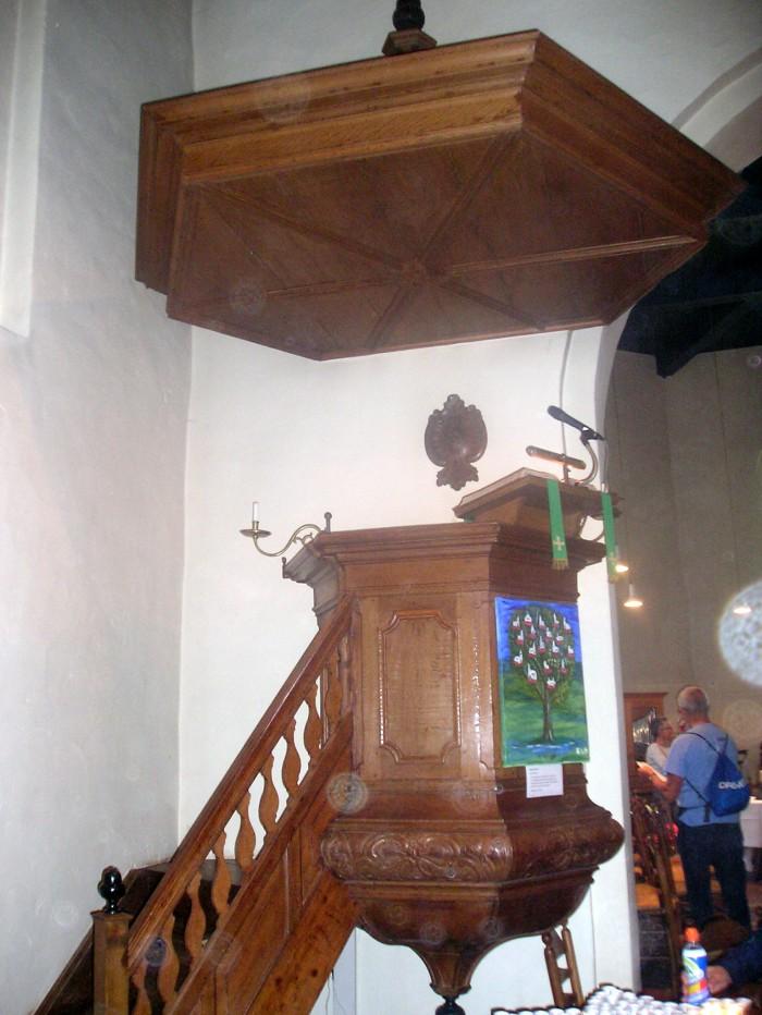 De eikenhouten preekstoel is in 1751 gemaakt door Jan Dieters Brugma uit Groningen. Deze heeft ook de kansels in Usquert en Zandeweer gemaakt. De kuip is zeshoekig, heeft een bollend, fors gesneden fries en panelen met lijstjes. Zowel onderaan de preekstoel als op het klankbord bevindt zich een eikelknop. De cartouche met baretknop tussen hemel en preekstoel is van Comelis Kooistra (1712-1796), bekend beeldsnijder uit Groningen. Eén van de twee kapstokjes voor de collectezakken is ook van zijn hand. De trap naar de preekstoel is in dezelfde stijl als de twee doophekken en het diakenbankje, dat meestal in het koor staat. Voor de restauratie van 1964-1968 waren deze doophekken onderdelen van de omheining van de dooptuin rond de preekstoel, die toen tegen de zuidmuur stond.Deel deze preekstoel