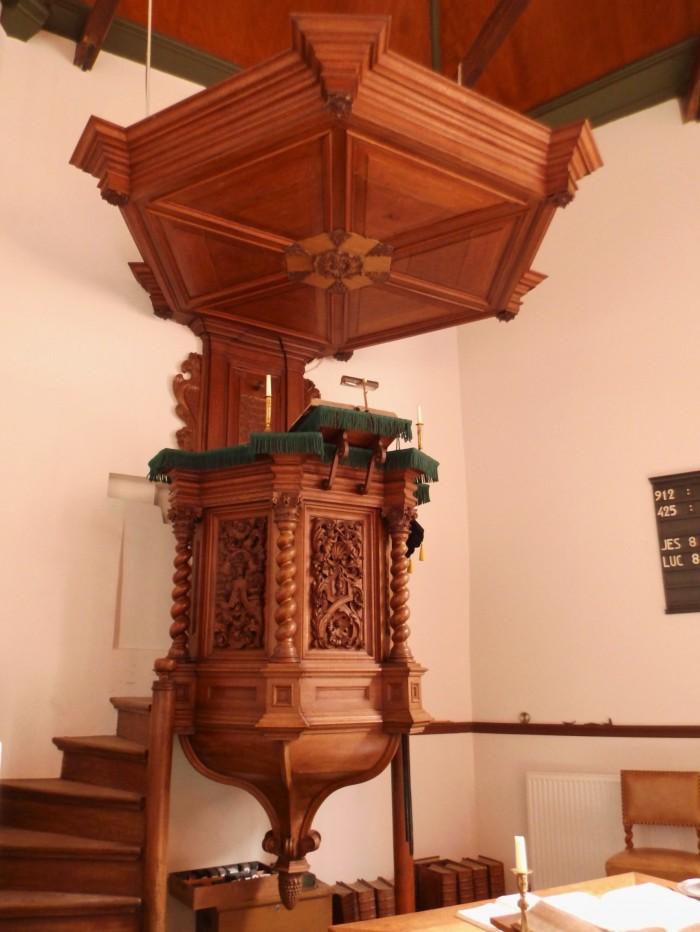 De preekstoel is uit 1727 en gemaakt door Poules Rycles en Cornelis Corneliszn. In de preekstoel een bijzondere tekst: “Indien yemand spreeke, hij spreeke de woorden Godtsâ€.Deel deze preekstoel