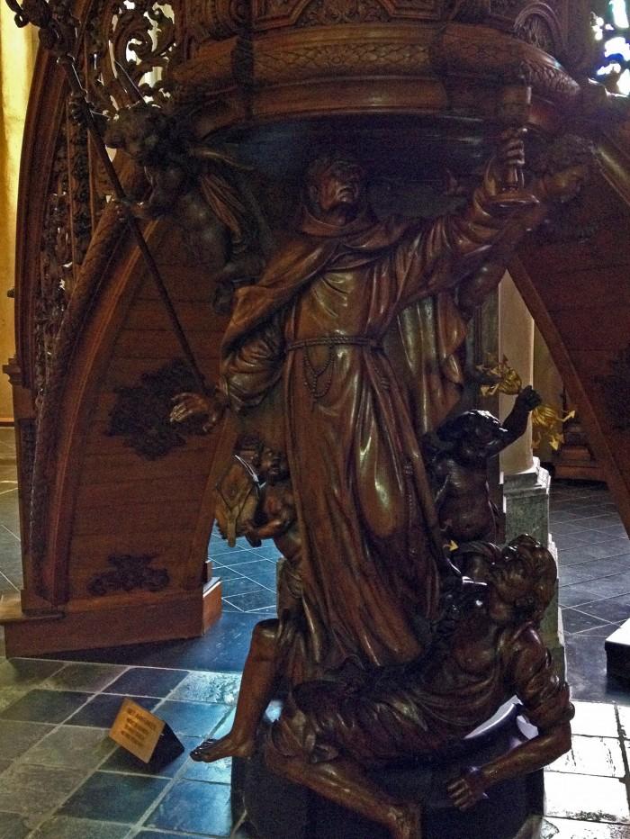 De preekstoel is door Petrus Vinck tussen 1725 en 1732 vervaardigd in Vlaamse rococostijl en is het meest indrukwekkende kunstwerk in de kerk. De figuur onder de kuip stelt Johannes van Capistrano voor, die de ketterij vertrapt.Deel deze preekstoel