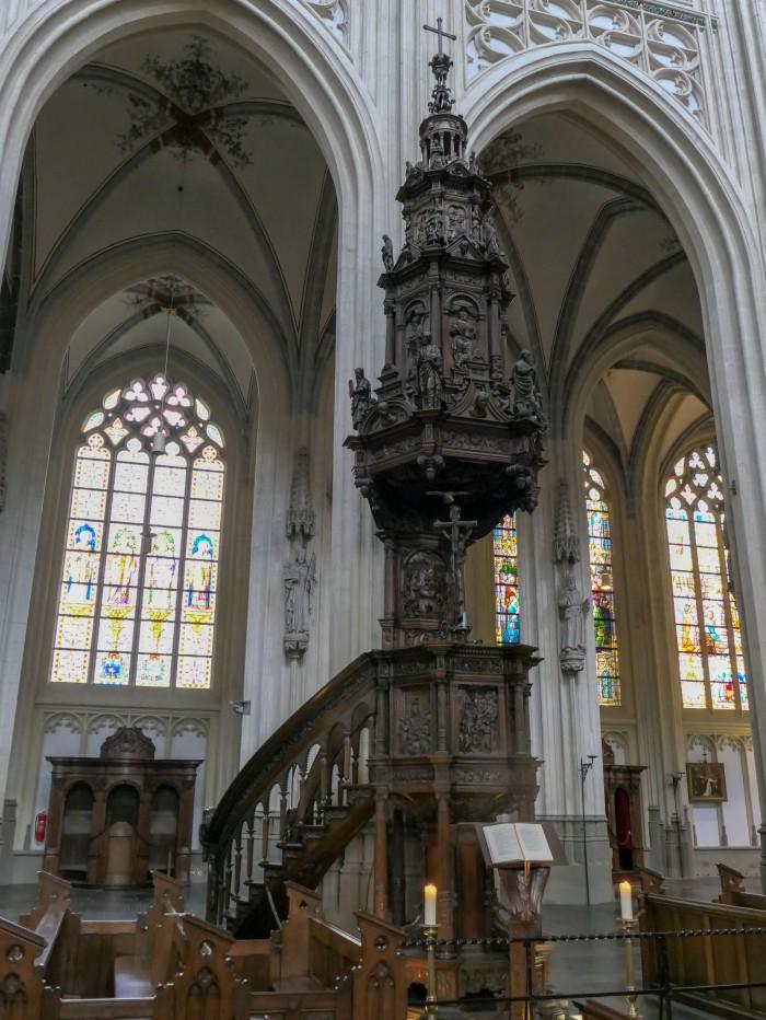 De preekstoel uit 1550 werd in gedeelten vervaardigd is duidelijk geinspireerd op motieven en vormen van de renaissance. Zowel de kuip als het baldakijn erboven hebben een zeshoekige vorm. De kuip is aan de onderkant voorzien van een gesneden gewelf dat steunt op een forse hoofdpijler die omringd door zes slanke Korinthische zuiltjes die mede de kuip dragen. De Korinthische zuiltjes worden herhaald op de hoeken van de kuip. Daartussen zijn op de panelen van de kuip fraaie reliëfs aangebracht waarop predicaties uit het Nieuwe Testament worden uitgebeeld. De verbinding tussen kuip en baldakijn wordt gevormd door een fraai gesneden paneel waarop is afgebeeld hoe de kerkpatroon, Sint Jan de Evangelist, wordt gemarteld in de kokende olie. Het klankbord wordt bekroond door een eveneens zeshoekige, overdadig versierde troonhuif van zes meter hoogte. Ook hier nemen de verkondigers van het geloof een belangrijke plaats in behalve de vier evangelisten, enkele apostelen en kerkvaders zijn ook oudtestamentische profeten weergegeven.Deel deze preekstoel