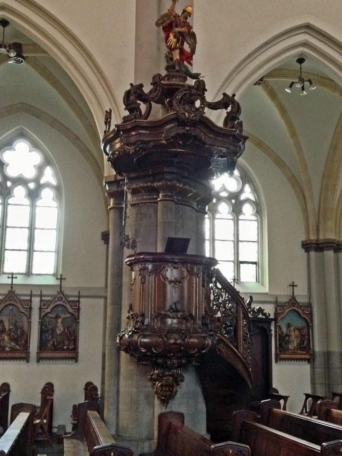 De preekstoel uit 1774 in Louis XV stijl in de St. Petruskerk ofwel Grote Kerk. De rijke ornamentatie wordt bekroond door een beeld van de H. -Michaël die de draak verslaatDeel deze preekstoel