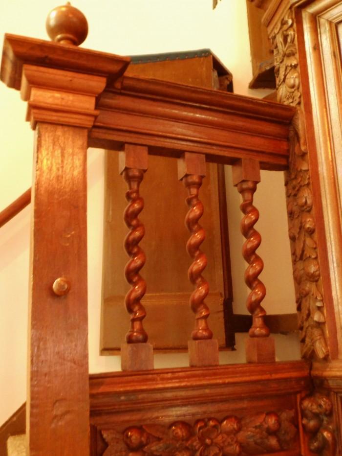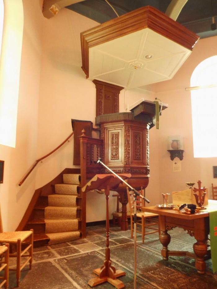 17e eeuwse eiken preekstoel. Hij is versierd met bladeren, sparappels en eikels en een vogel in het midden. Symbolen voor de opstanding.Deel deze preekstoel