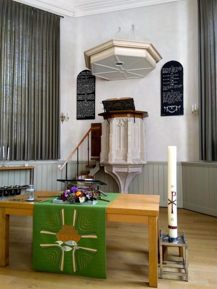 Laatgotische zandstenen preekstoel uit 1519, afkomstig uit de oude parochiekerk van Tubbergen.