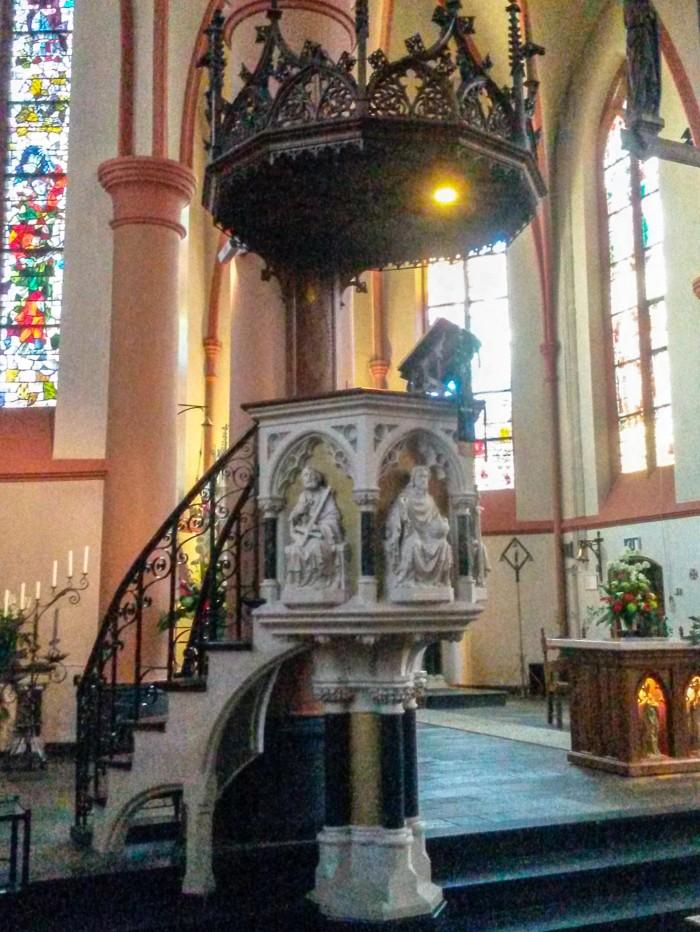 De neogotische preekstoel is ontworpen door F.W. Mengelberg. Hij deed dit naar middeleeuws voorbeeld, m.n. de 13de en 14de eeuwse franse en duitse gotiek vormden een inspiratiebron. Het vormde een tegenhanger van de "Amsterdamse school".Deel deze preekstoel