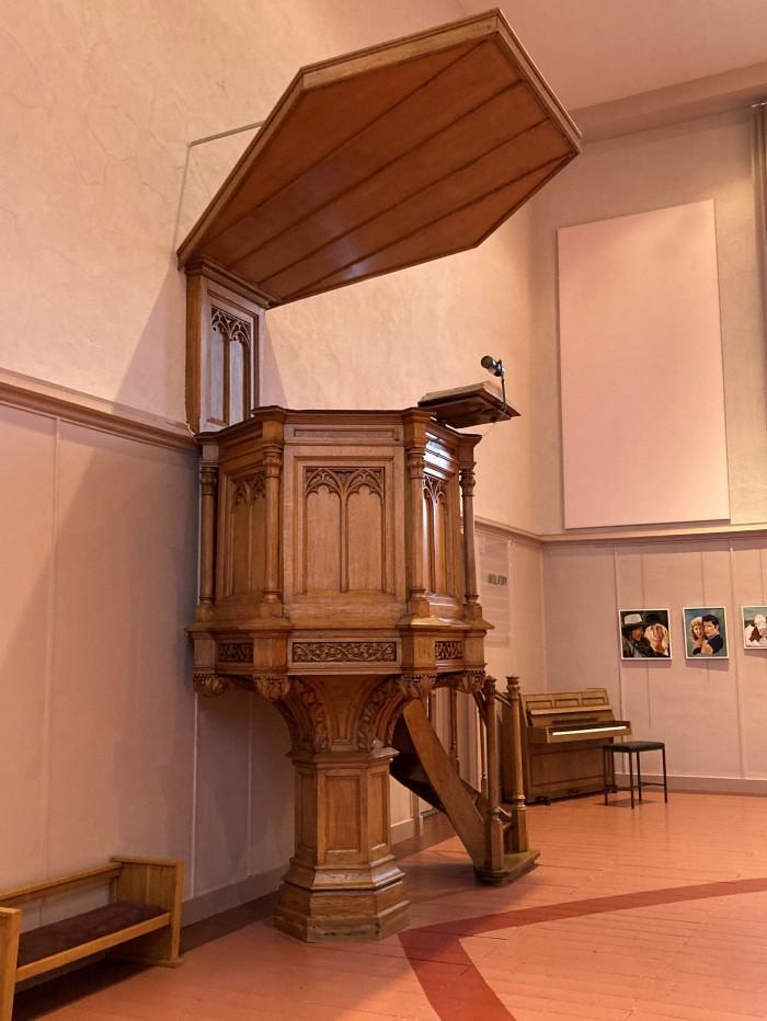 Houten preekstoel met groot schuin klankbord.Deel deze preekstoel
