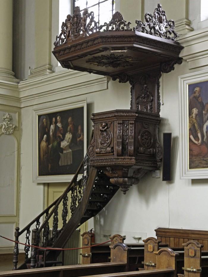 Eikenhouten kansel uit 1860.Op de preekstoel zijn drie drie panelen met medaillons te zien:
