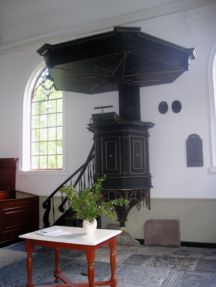 Centraal tegen de achterwand van het liturgisch centrum staat de zwartgeverfde preekstoel. Deze preekstoel is eveneens eclectisch van ontwerp met een classicistische kuip, die aan onderzijde is versierd met gietijzeren gotische ornamenten. Boven de preekstoel hangt een klankbord. De preekstoel werd bij de bouw in 1863 geschonken door unicus collator Johan Hora Siccama. Onderaan de preekstoel staat dan ook met goudletters geschilderd 'Geschenk van den primarius collator 1863'.