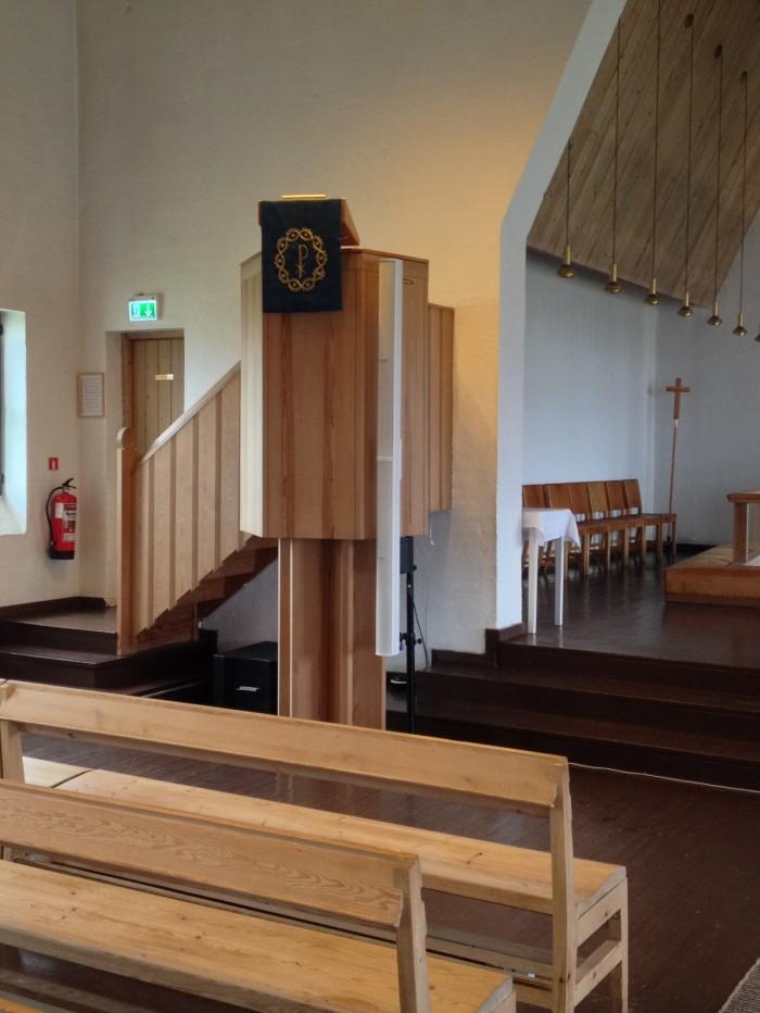 Ingewijd op 05-10-1958 en gemaakt in Zweedse stijl van eiken door Eyvind MoestueDeel deze preekstoel