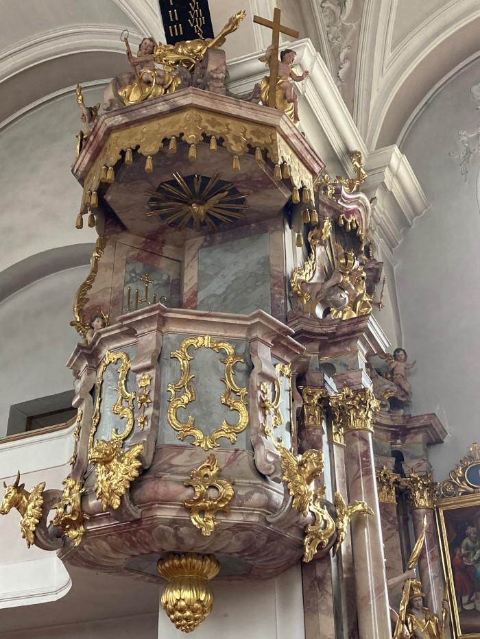 De preekstoel in barokstijl uit 1776 werd gebouwd door Franz Stitz..Deel deze preekstoel