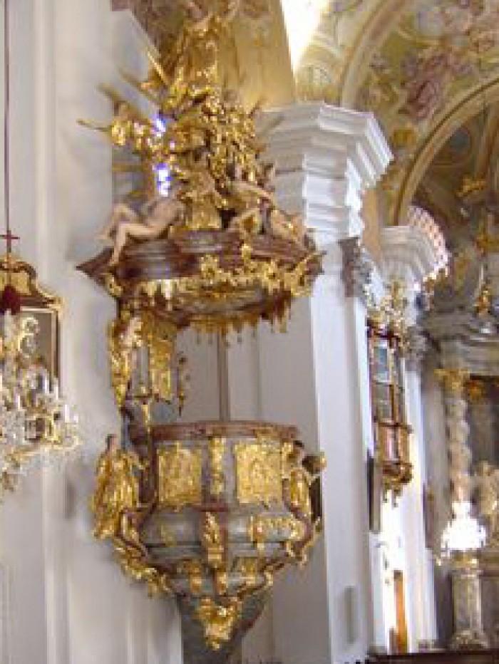 De bouw van de kerk is begonnen in 1636.De preekstoel is ongetwijfeld het meest indrukwekkend stuk architectuur van de kerk, ontworpen door Veit Königer.