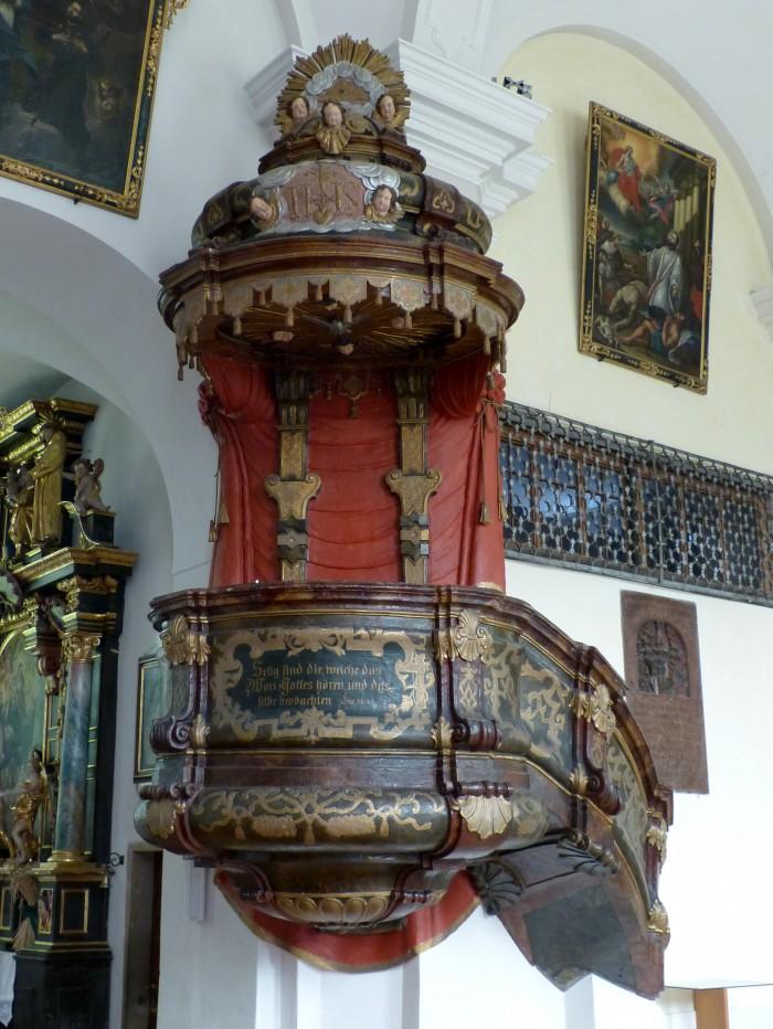 Houten, fraai beschilderde preekstoel uit het midden van de 18e eeuw (1737-1740). Aan de voorzijde is de tekst van Lucas 11, vs 28 te lezen: Selig sind die, welche das Wort Gottes hören, und das selbe beobachten.Deel deze preekstoel