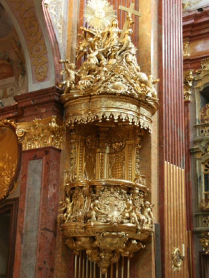 geheel vergulde preekstoel en rijkelijk versierdDeel deze preekstoel