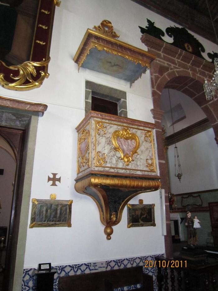 Rechthoekige preekstoel met vergulde bewerkingen.De kerk werd na een aardbeving in 1748 herbouwd en in 1818 gewijd.