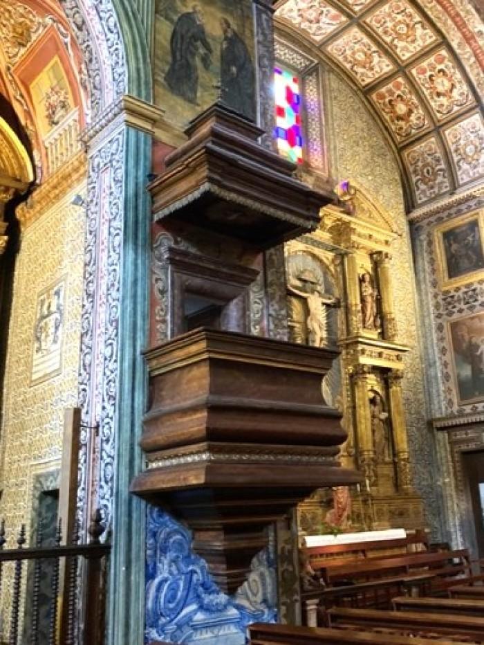 Rechthoekige preekstoel met rondom mozaiektegels.Deel deze preekstoel