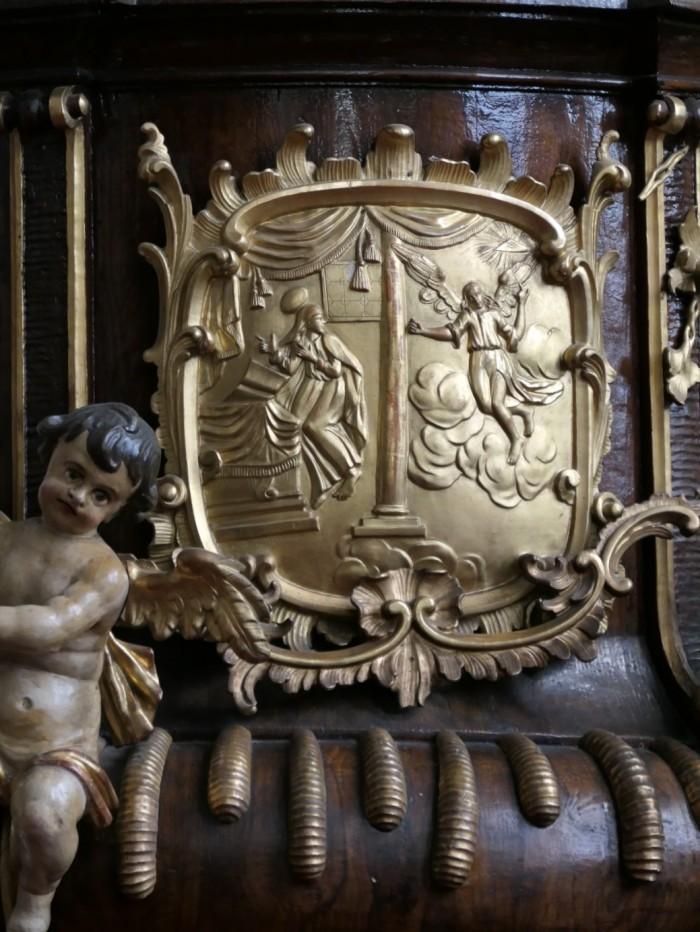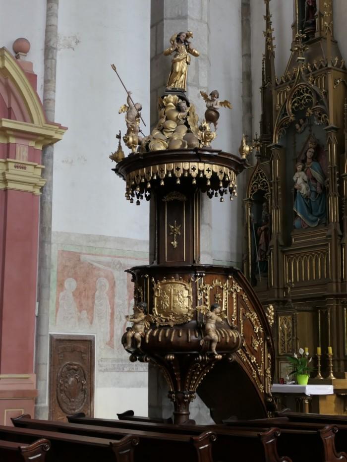 Rococo preekstoel uit 1864.Deze is versierd met een reliëf van de Aankondiging van de Maagd Maria en een Christusbeeld in de symbolische vorm van de zogenaamde Goede Herder.Deel deze preekstoel