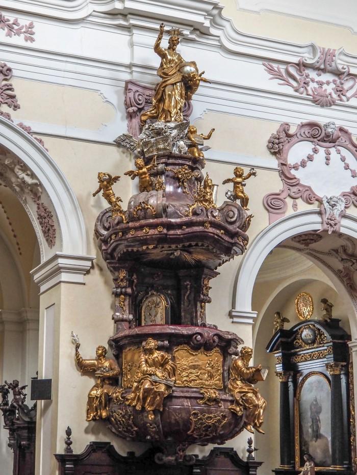 Rococo preekstoel uit 1752-1753. Het is gemaakt van marmer met houtsnijwerk. Het is het werk van V. Hennevogel, beeldhouwer A. Eckert en schilder F. Beldinger. De kuip van de preekstoel is versierd met pilasters en sculpturen van de heiligen Stephanus, Petrus, Paulus en Laurens. Daartussen zijn er drie reliëfs te zien. Op het klankbord bevinden zich engelen, symbolen van evangelisten en zegeningen van Christus.Deel deze preekstoel
