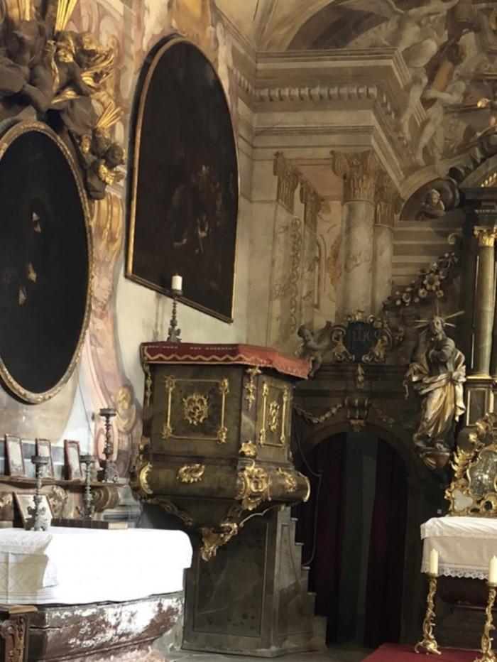 Vierkante preekstoel zonder klankbord. Aan de zijkanten vergulde decoraties.Deel deze preekstoel