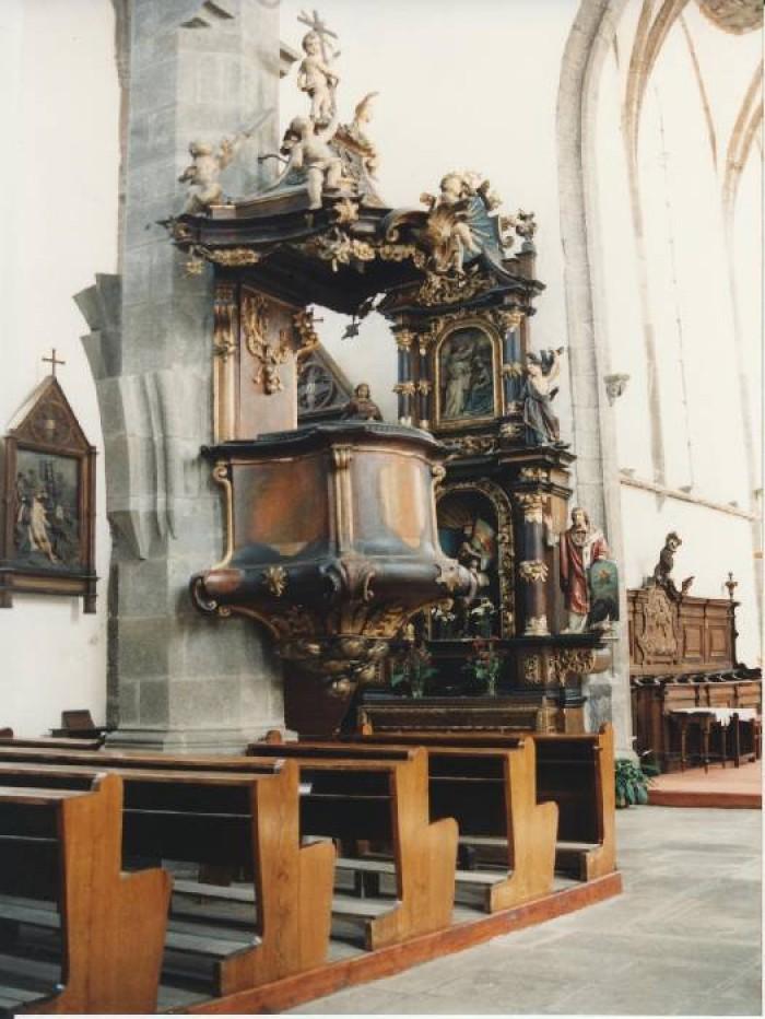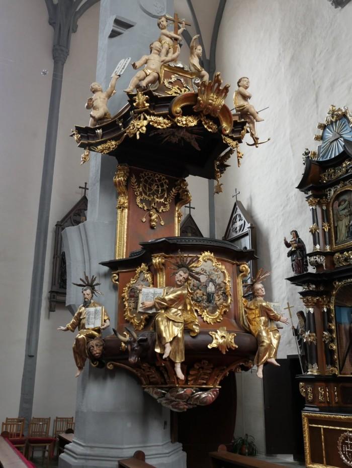 Preekstoel uit de 18e eeuw. Langs de kuip beelden van de evangelisten.Deze kerk hebben wij ook al in 1993 een keer bezocht en toen waren de beelden en illustraties van de kuip verwijderd (Zie 2e foto).