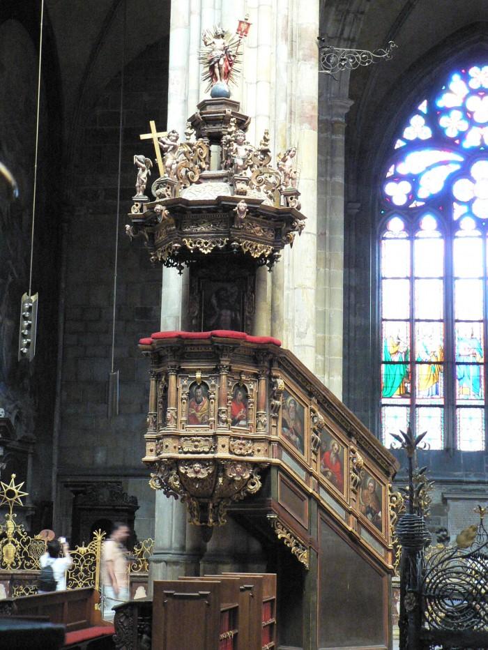 Op de kuip zijn geschilderde borden met evangelisten en de figuur van St. Vit aangebracht. Langs de trap omhoog zijn ​​schilderijen van de kerkvaders te zien: Rehore, sv. Augustine, Jerome en Ambrose, alsmede engelen met schedel en zandloper.