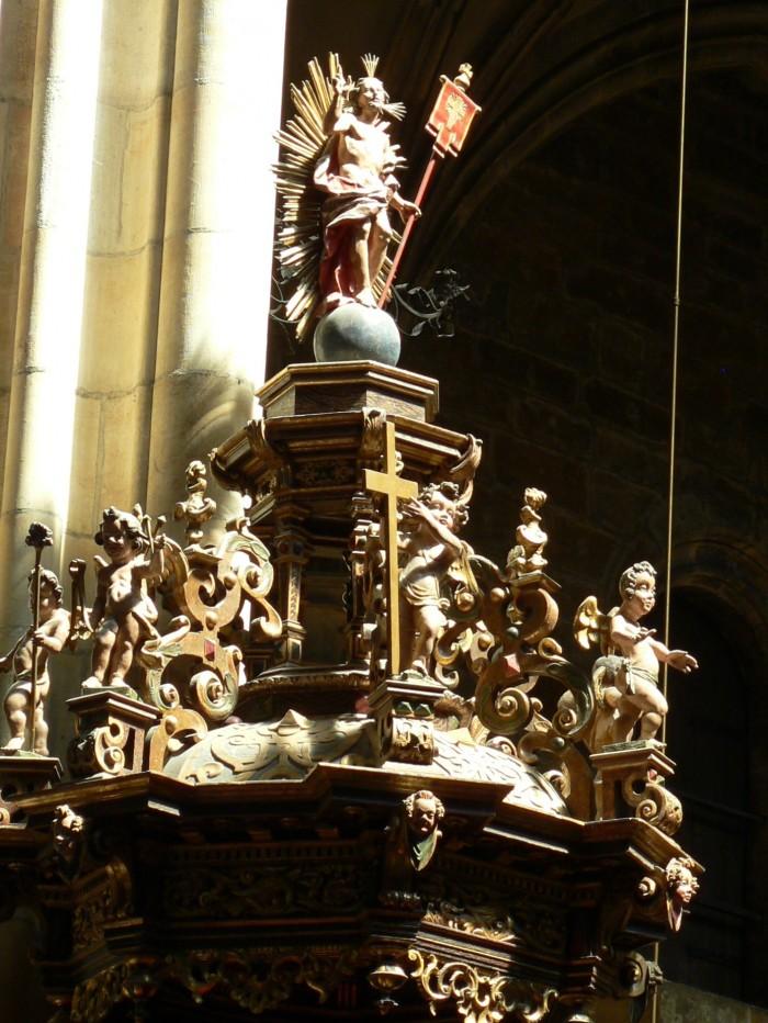 Op het klankbord (zie 2e foto) een baldakijn met het beeld van de verrezen Christus. Daaronder zijn engelen met instrumenten van de rouw van Christus. Onderaan de preekstoel is een duif - het symbool van de Heilige Geest.