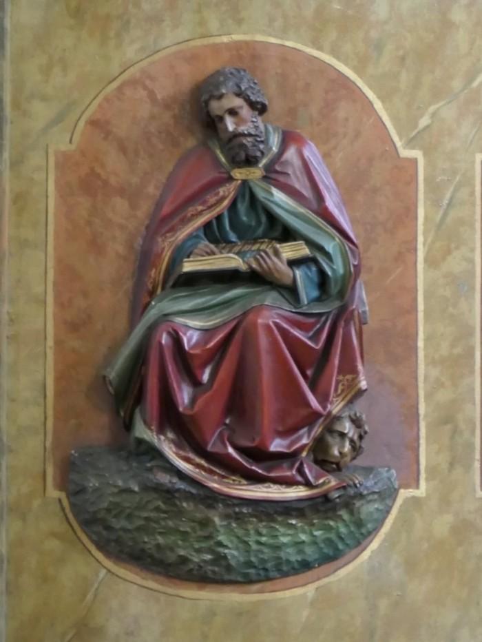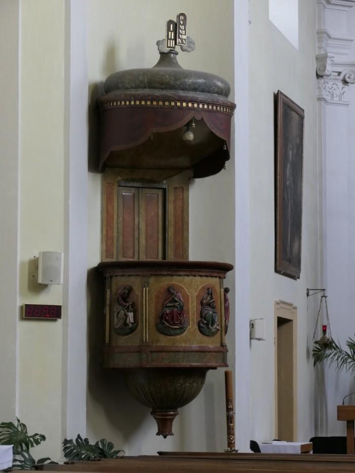 Ronde preekstoel uit 1965. Bovenop het klankbord een afbeelding van de stenen tafelen met daarop de tien geboden. Op de kuip afbeeldingen van de apostelen (zie ook 2e foto). In de achterwand een deur om de preekstoel te betreden.De kerk zelf is uit de 18e eeuw.