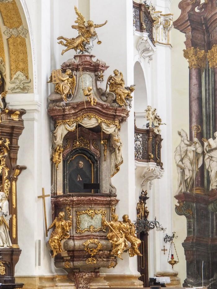 Eenschepige jezuïetenkerk, uit 1658, met een vierkant presbyterium en kapellen op de zijkanten. De kerk werd door de architect C. Lurago gebouwd. Het interieur heeft een laatbarok aanzienDeel deze preekstoel